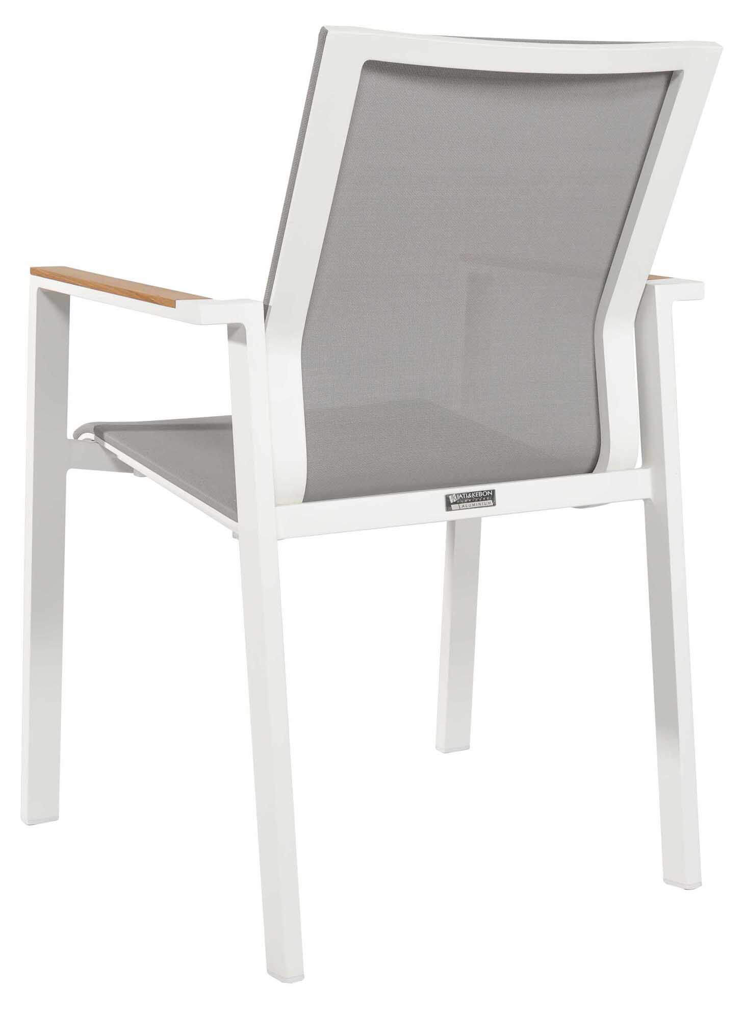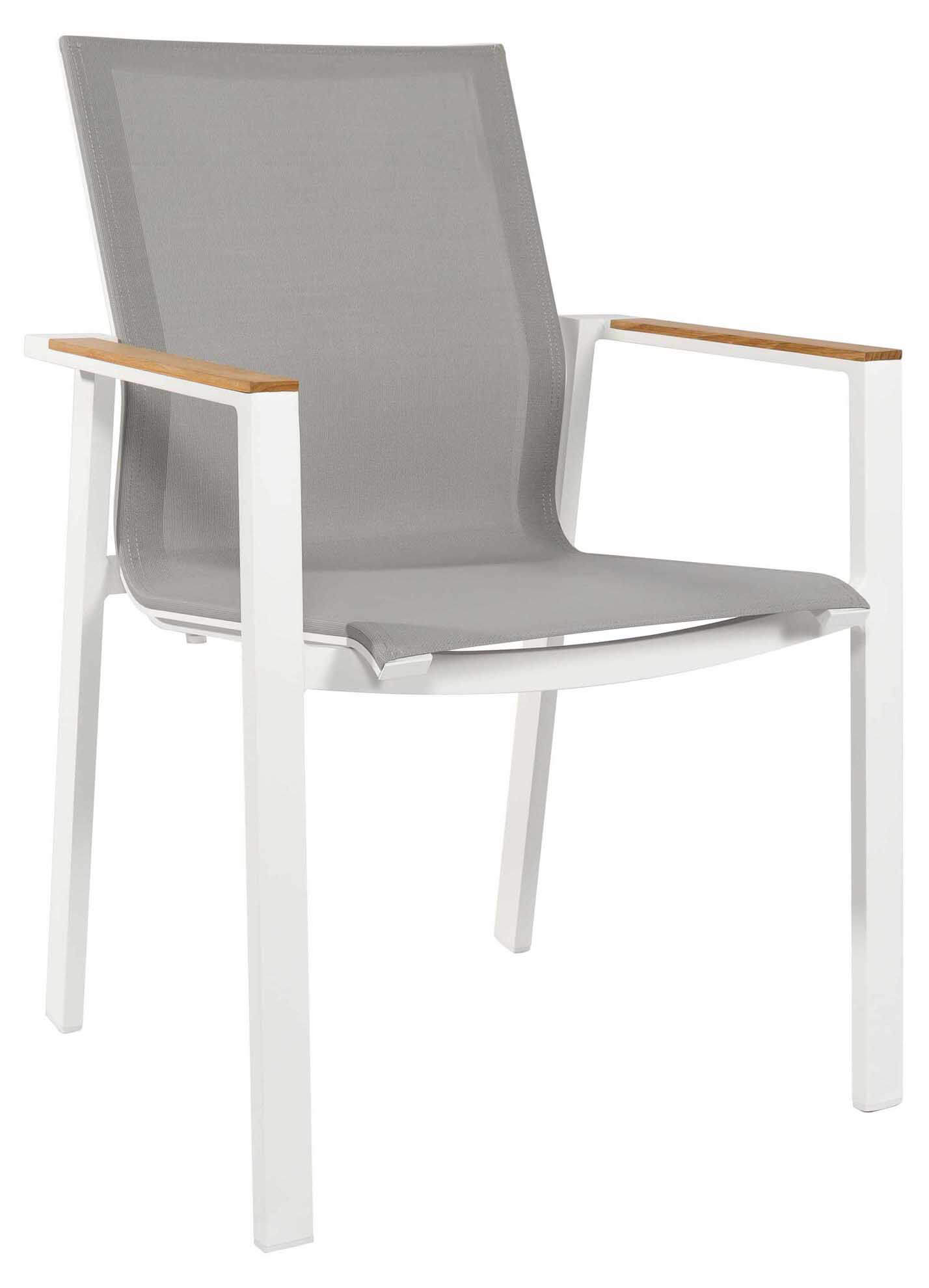 Der robuste Beja Gartensessel von Jati & Kebon besteht aus einem hochwertigen Aluminiumgestell mit Pulverbeschichtung und einer Bespannung aus Jatex-Gewebe. Die Armlehnen aus Teakholz sind ein visuelles sowie haptisches Highlight, das den eleganten Look des Stuhls noch abrundet. Armlehnen aus Holz sorgen nicht nur für ein angenehmes, natürliches Sitzgefühl sondern werden auch bei starker Sonneneinstrahlung nicht heiß. Für bequemes und entspanntes Sitzen sorgt auch die ergonomisch geformte und leicht geneigte Rückenlehne. Die Bespannung aus Jatex-Gewebe ist robust und langlebig und auch ohne Kissen sehr bequem. Der Beja Stapelsessel ist dank hochwertiger Materialien und penibler Verarbeitung absolut wetterfest und ganzjährig einsatzbereit. Bis zu sechs Beja Sessel können ineinander gestapelt werden.