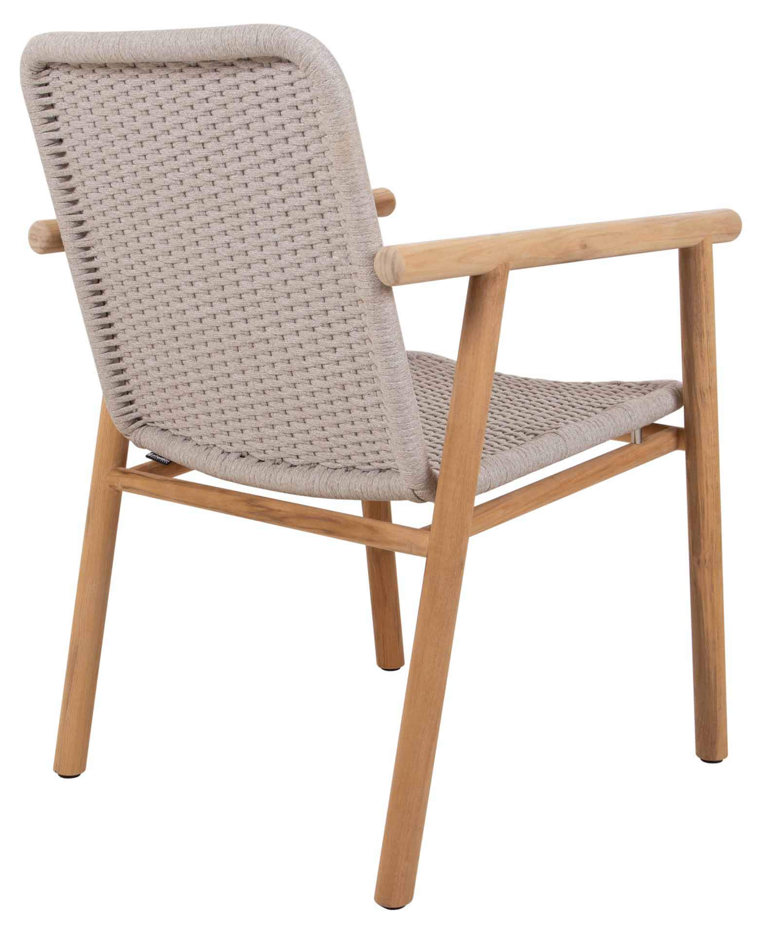 Gestell und Materialien: Das Gestell besteht aus hochwertigem Teakholz, das für seine Langlebigkeit und natürliche Schönheit bekannt ist. Die Sitz- und Rückenfläche sind aus einem stabilen Aluminiumrahmen gefertigt und mit strapazierfähigem Rope-Geflecht in der Farbe „linnen“ bespannt, was für zusätzlichen Komfort und Eleganz sorgt.