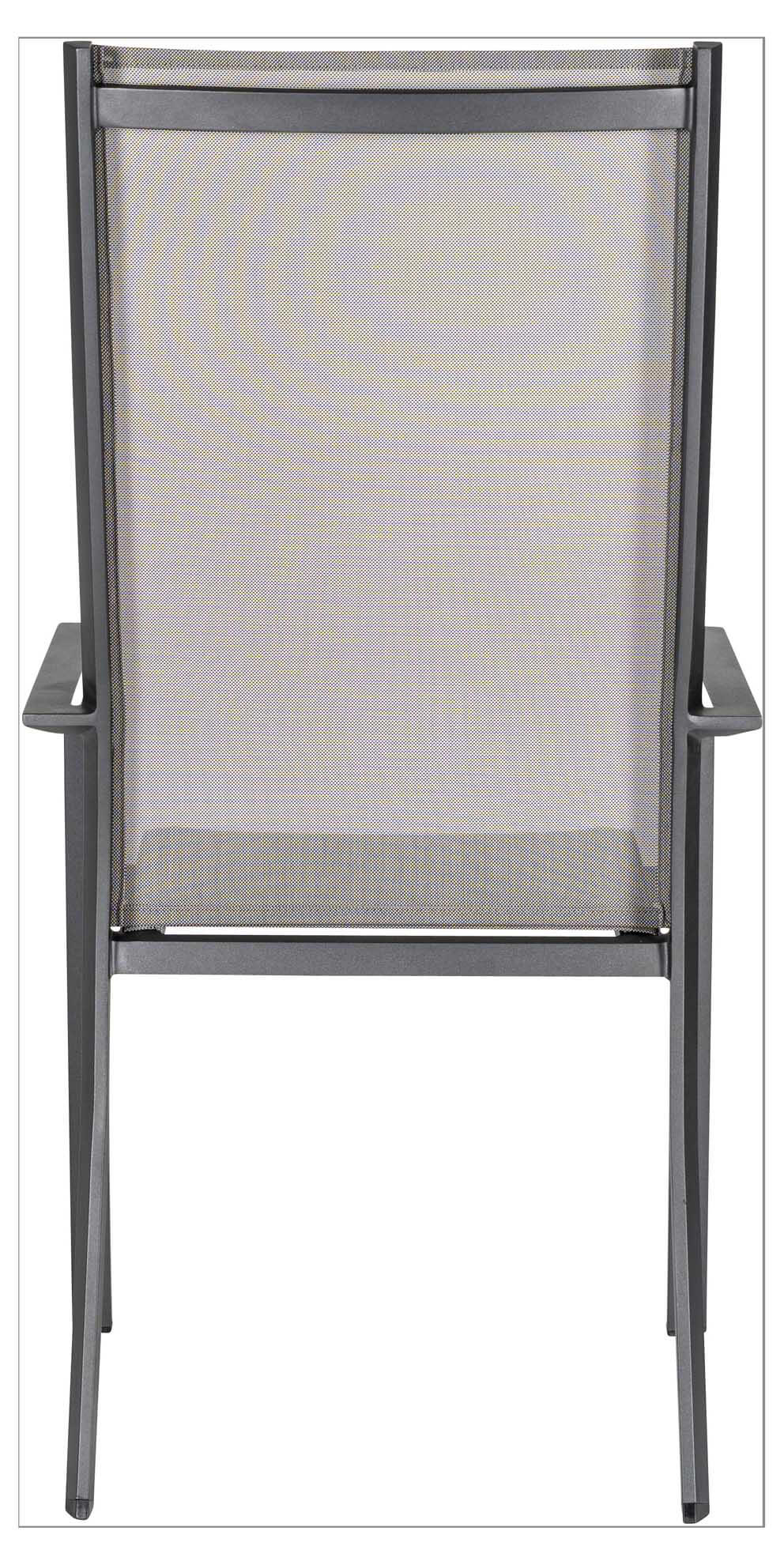Dransy Stapelsessel mit hoher Rückenlehne von Jati & Kebon aus Aluminium. Gestell eisengrau matt pulverbeschichtet, Bespannung aus Jatex-Gewebe silbergrau.