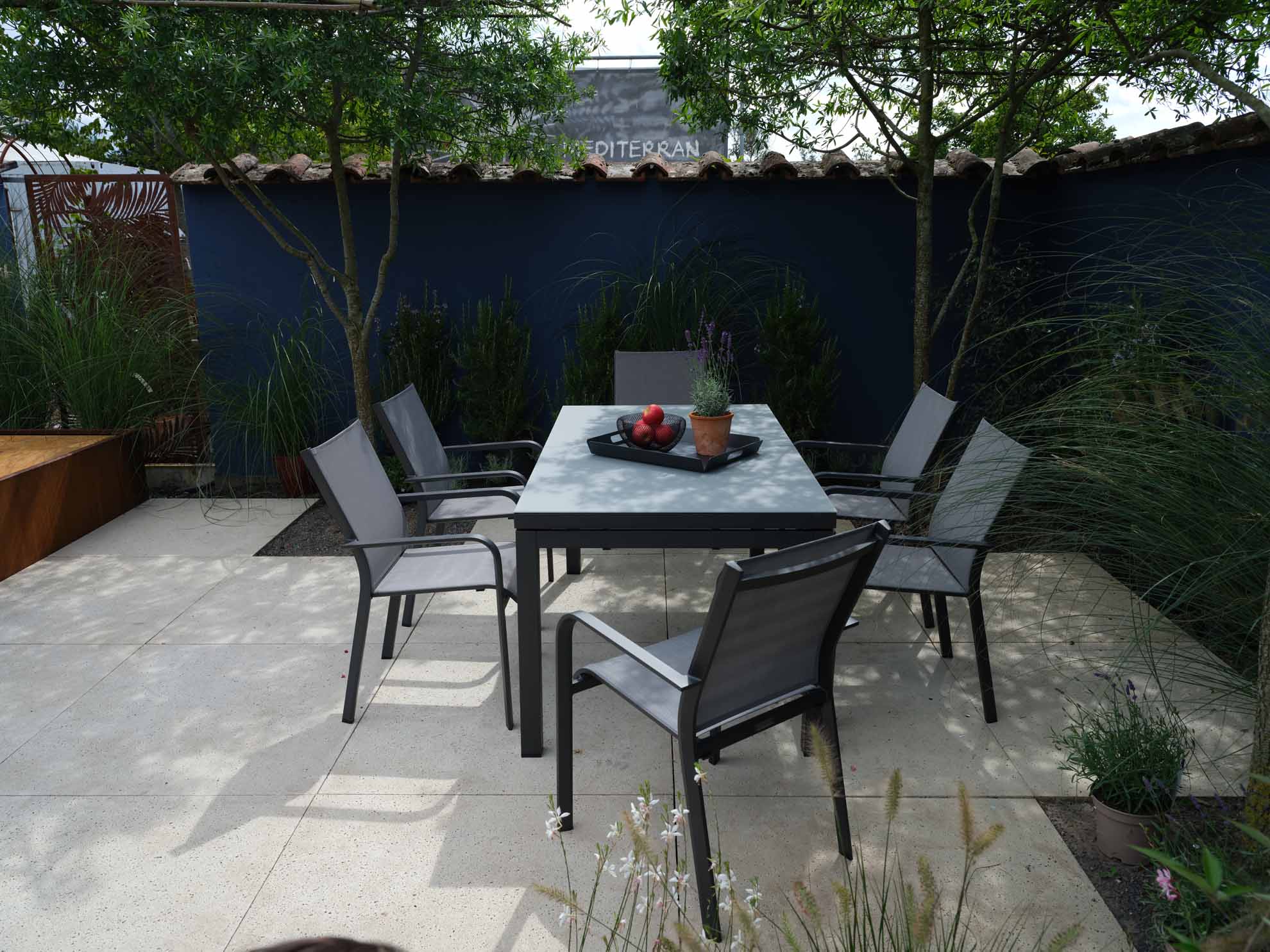 Dransy Stapelsessel von Jati & Kebon aus Aluminium. Gestell eisengrau matt pulverbeschichtet, Bespannung aus Jatex-Gewebe silbergrau.