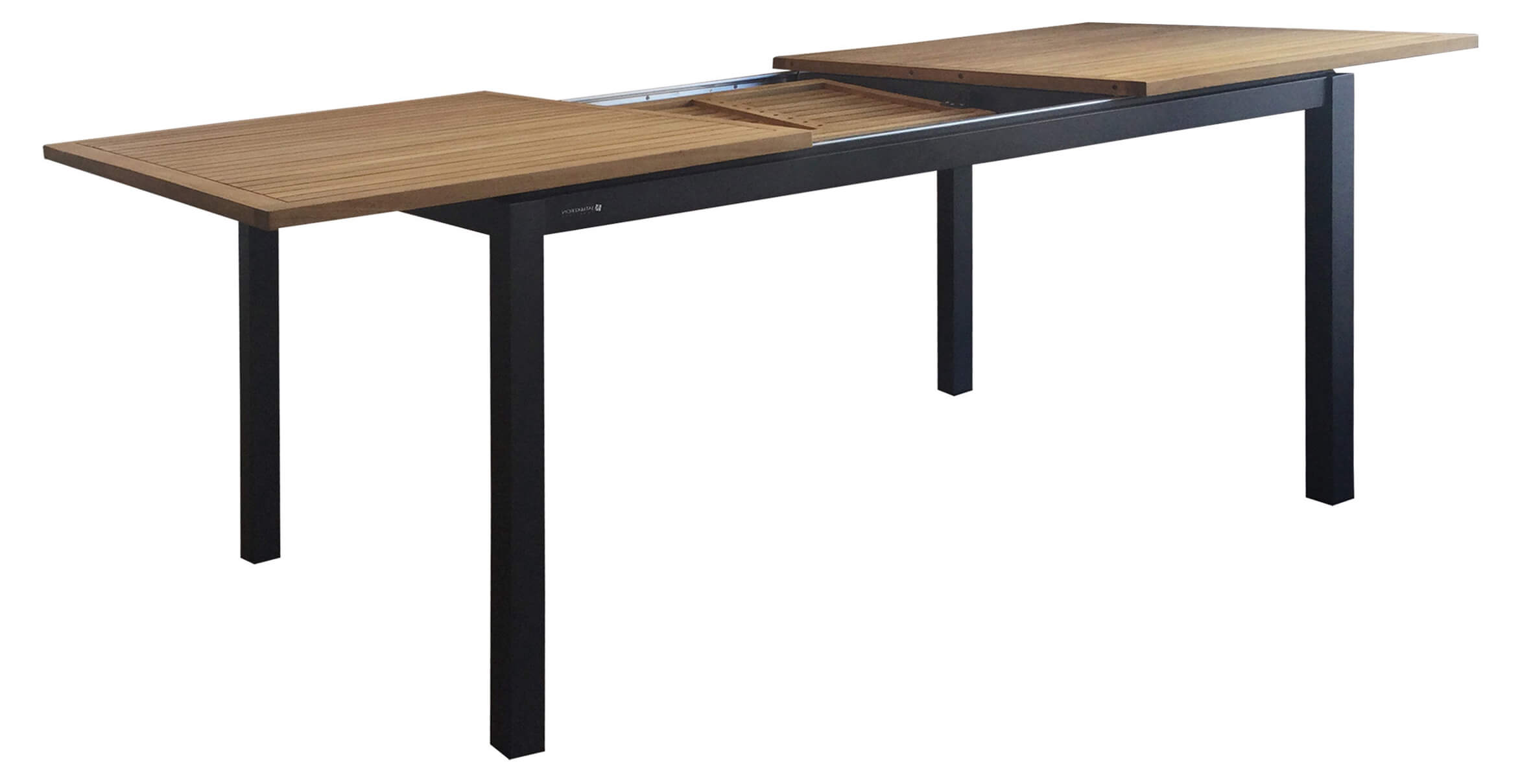 Die Tischplatte des Kreta Ausziehtischs ist aus hochwertigem Teakholz gefertigt. Teakholz ist bekannt für seine Widerstandsfähigkeit gegenüber den Elementen und sein zeitloses Erscheinungsbild. Es ist eine hervorragende Wahl für Gartenmöbel, da es nicht nur robust ist, sondern auch natürliche Schönheit und Wärme ausstrahlt. Die natürliche Maserung des Teakholzes verleiht dem Tisch zudem eine besondere Note und macht ihn zu einem Blickfang in Ihrem Außenbereich.